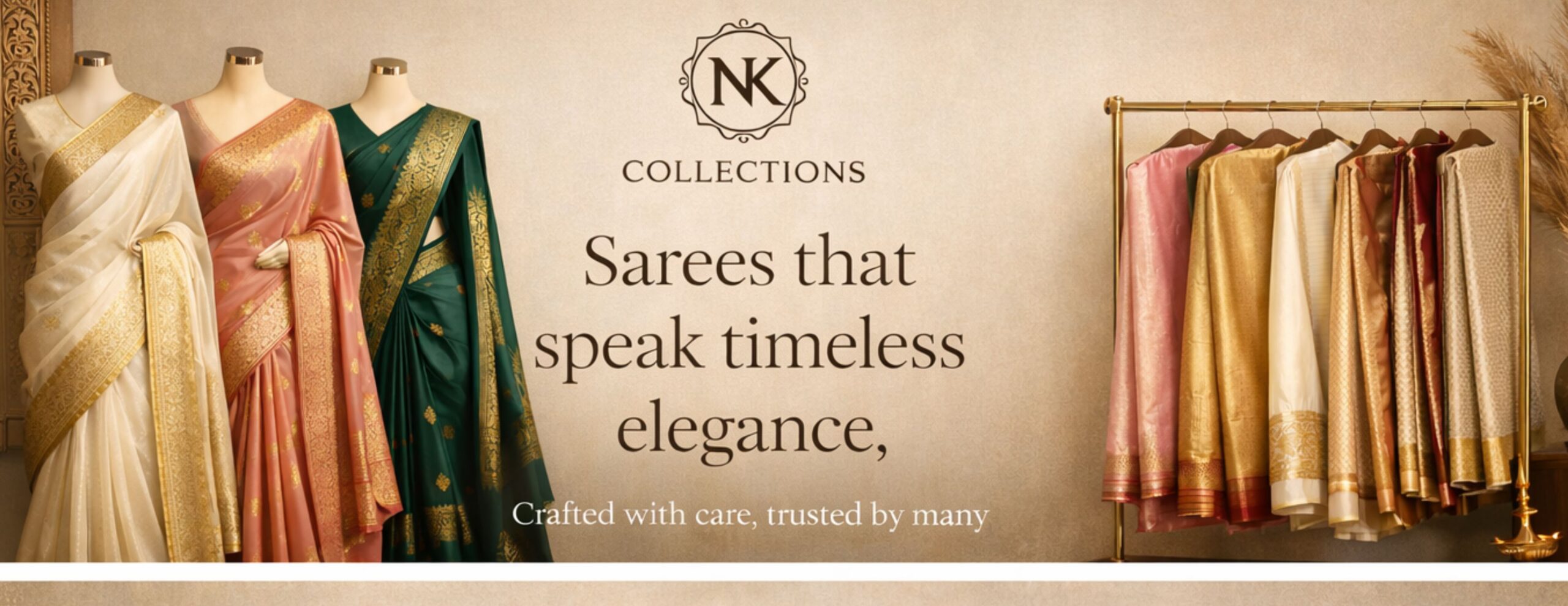 NK Collections is a trusted shopping destination for premium sarees that celebrate tradition, elegance, and timeless style. We offer a carefully curated collection of handloom and contemporary sarees, sourced for quality, comfort, and craftsmanship.